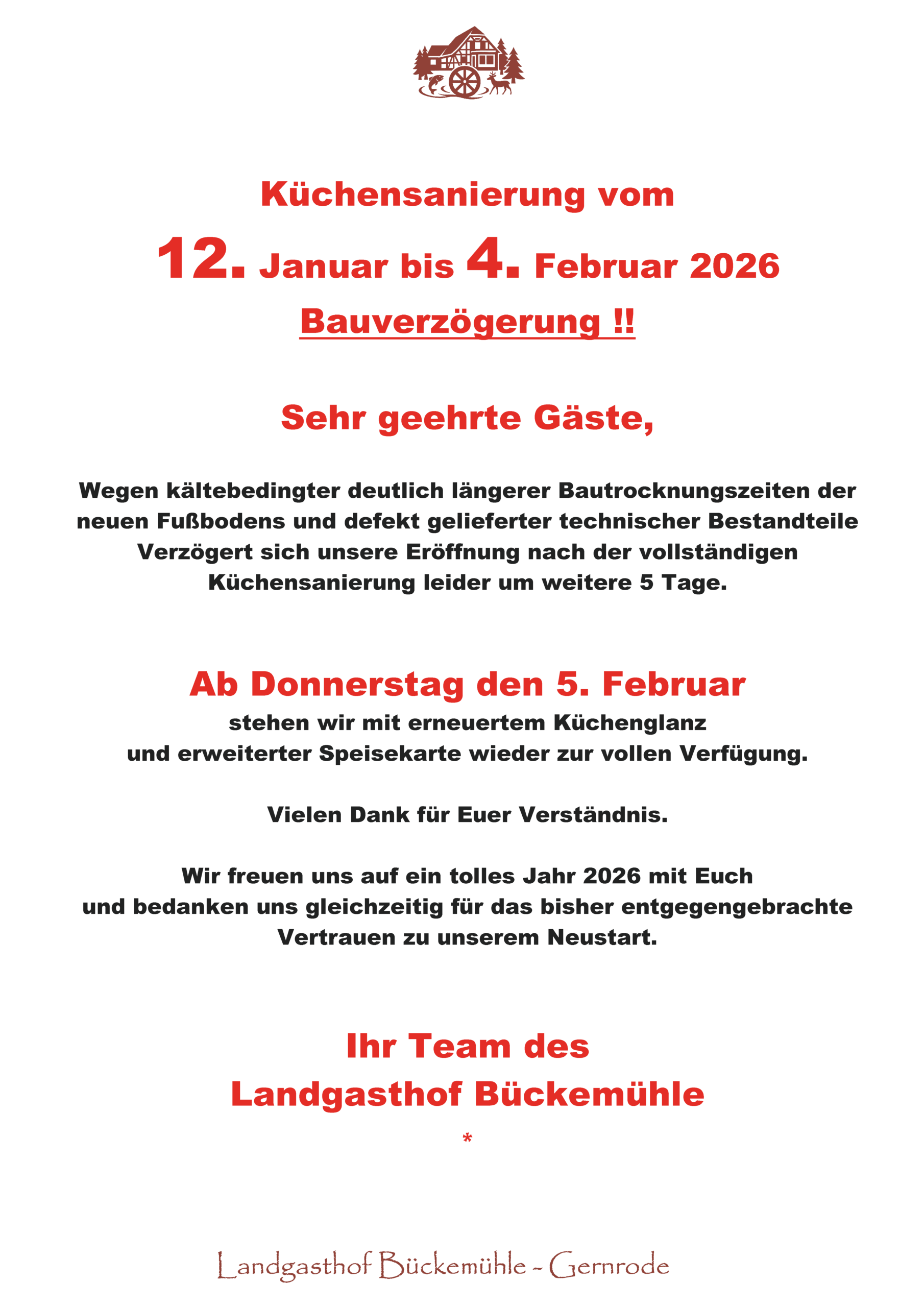 stehen wir mit leichter Verzögerung in erneuertem Küchenglanz und erweiterter Speisekarte wieder zur vollen Verfügung.